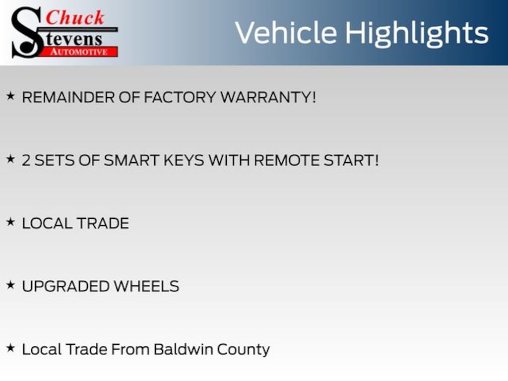 At Chuck Stevens Ford, we also include our exclusive Lifetime Powertrain Warranty at no additional cost. No gimmicks, no fine print, and serviceable at any certified repair facility nationwide.