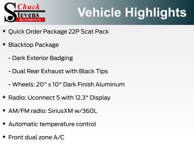 Inside, the Charger R/T Scat Pack pampers you with luxurious amenities, including heated front seats, a heated steering wheel, dual-zone automatic climate control, and a premium Uconnect 5 infotainment system with a large 12.3-inch display. Stay connected with Apple CarPlay, Android Auto, and a 4G LTE Wi-Fi hotspot. The ParkView Rear Back-Up Camera and advanced safety technologies provide added confidence and convenience.