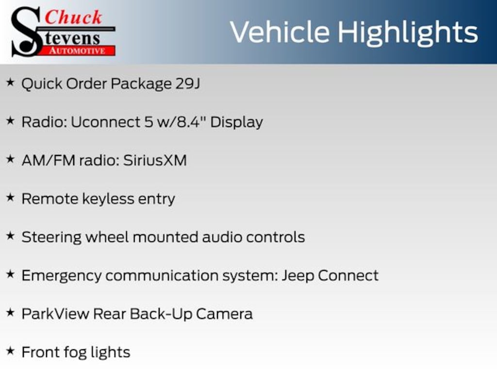 Alloy wheels, AM/FM radio: SiriusXM, Emergency communication system: Jeep Connect, Front fog lights, Fully automatic headlights, ParkView Rear Back-Up Camera, Quick Order Package 29J, Radio: Uconnect 5 w/8.4" Display, Remote keyless entry, Steering wheel mounted audio controls, Telescoping steering wheel, Tilt steering wheel.