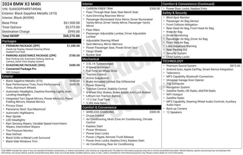 Elevate your daily commute and weekend adventures with the premium features of this 2024 BMW X3 M40i. Enjoy the convenience of wireless charging, the clarity of the Harman Kardon surround sound system, and the confidence of the Head-Up Display and Advanced Driver Assistance technologies. The Shadowline Exterior Trim and 20-inch M-Style alloy wheels add a bold, sporty flair to this exceptional SAV.