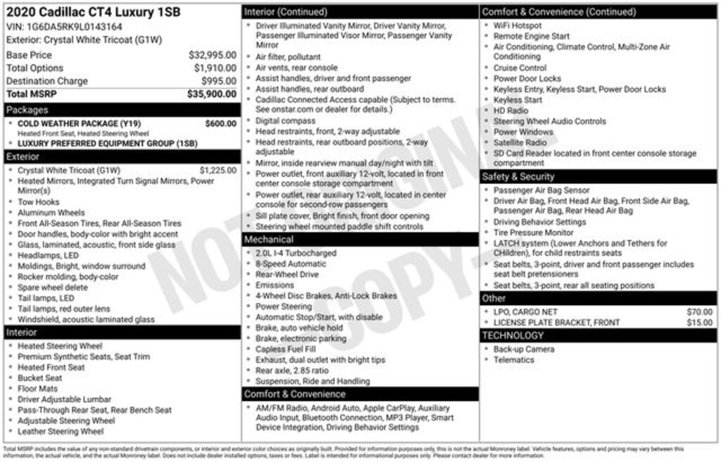2020 Cadillac CT4 Luxury 4D Sedan Luxury Crystal White Tricoat RWD 2.0L Turbocharged 8-Speed Automatic