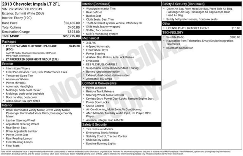 Welcome to Chuck Stevens Chevrolet located on HWY 31 South, Bay Minette Alabama. We are home of Lifetime Powertrain Warranty. A Lifetime Powertrain Warranty at no additional cost.Grab a great deal with our low-price guarantee on this 2013 Chevrolet Impala LT while we still have it. At Chuck Stevens Chevrolet our Pre-Owned vehicles have been fully inspected and reconditioned by a certified technician. The White 2013 Chevrolet Impala LT with Cloth Seat Trim interior is a wonderful choice.The online price includes a $2,500 Cash Down or trade equity. To qualify, customers must trade in a vehicle with a minimum appraised value of $2,500 or Cash Down. All prices reflect dealership financing and include a $1,000 finance coupon. See dealer for full details.- SiriusXM Satellite Radio- Bluetooth® For Phone- Fully automatic headlights- Tilt steering wheel- Low tire pressure warning- 17 Machined Aluminum Wheels- LT OnStar & Bluetooth Package- Preferred Equipment Group 2FLThis 2013 Chevrolet Impala LT is powered by a 3.6L V6 DGI DOHC VVT engine and a 6-Speed Automatic Electronic with Overdrive transmission, delivering an impressive 18 city / 30 highway MPG. With 151,602 miles, this Impala is a well-maintained, reliable vehicle that's ready to take you wherever the road leads.The spacious interior offers comfortable cloth seating, a comprehensive infotainment system with SiriusXM Satellite Radio, and a host of convenient features like power windows, power locks, and remote keyless entry. Safety is also a priority, with dual front and side impact airbags, electronic stability control, and a tire pressure monitoring system.Whether you're commuting to work, taking a road trip, or hauling cargo, this 2013 Chevrolet Impala LT is an exceptional choice. Its combination of performance, efficiency, and versatility make it a smart investment that will serve you well for years to come.Don't miss your chance to own this well-equipped Impala. Schedule a test drive today and experience the quality and value that Chuck Stevens Chevrolet has to offer.LIFETIME POWERTRAIN WARRANTY PROGRAM is included at no additional charge for all vehicles that have less than 80,000 miles. It is one of the most comprehensive powertrain warranty programs in the market. See dealer for details.