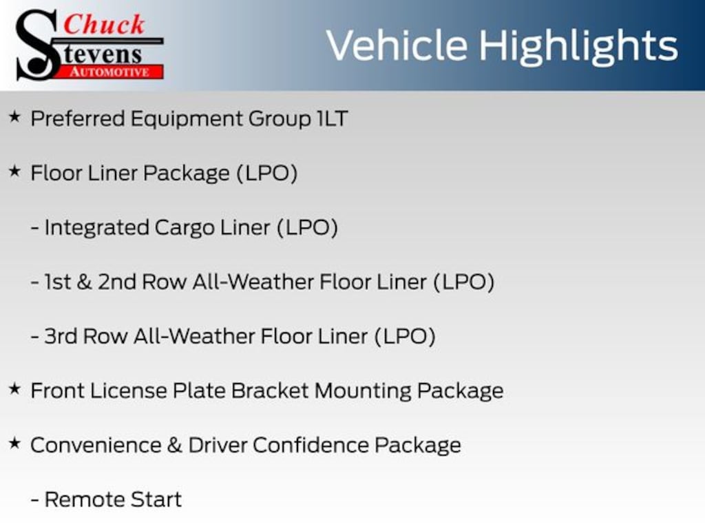 At Chuck Stevens Ford, we also include our exclusive Lifetime Powertrain Warranty at no additional cost. Serviceable at any certified repair facility nationwide.