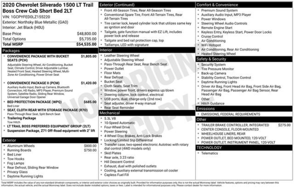 Welcome to Chuck Stevens Chevrolet located on HWY 31 South, Bay Minette Alabama. We are home of Lifetime Powertrain Warranty. A Lifetime Powertrain Warranty at no additional cost. Grab a great deal with our low-price guarantee on this 2020 Chevrolet Silverado 1500 while we still have it. At Chuck Stevens Chevrolet our Pre-Owned vehicles have been fully inspected and reconditioned by a certified technician. The Northsky Blue Metallic 2020 Chevrolet Silverado 1500 with Black Cloth interior is a great choice.The online price includes a $2,500 Cash Down or trade equity. To qualify, customers must trade in a vehicle with a minimum appraised value of $2,500 or Cash Down. All prices reflect dealership financing and include a $1,000 finance coupon. See dealer for full details.Clean CARFAX.Recent Arrival!2020 Chevrolet Silverado 1500 LT Trail Boss Northsky Blue Metallic 4D Crew Cab LT Trail Boss 4WD EcoTec3 5.3L V8 10-Speed AutomaticLIFETIME POWERTRAIN WARRANTY PROGRAM is included at no additional charge for all vehicles that have less than 80,000 miles. It is one of the most comprehensive powertrain warranty programs in the market. See dealer for details.