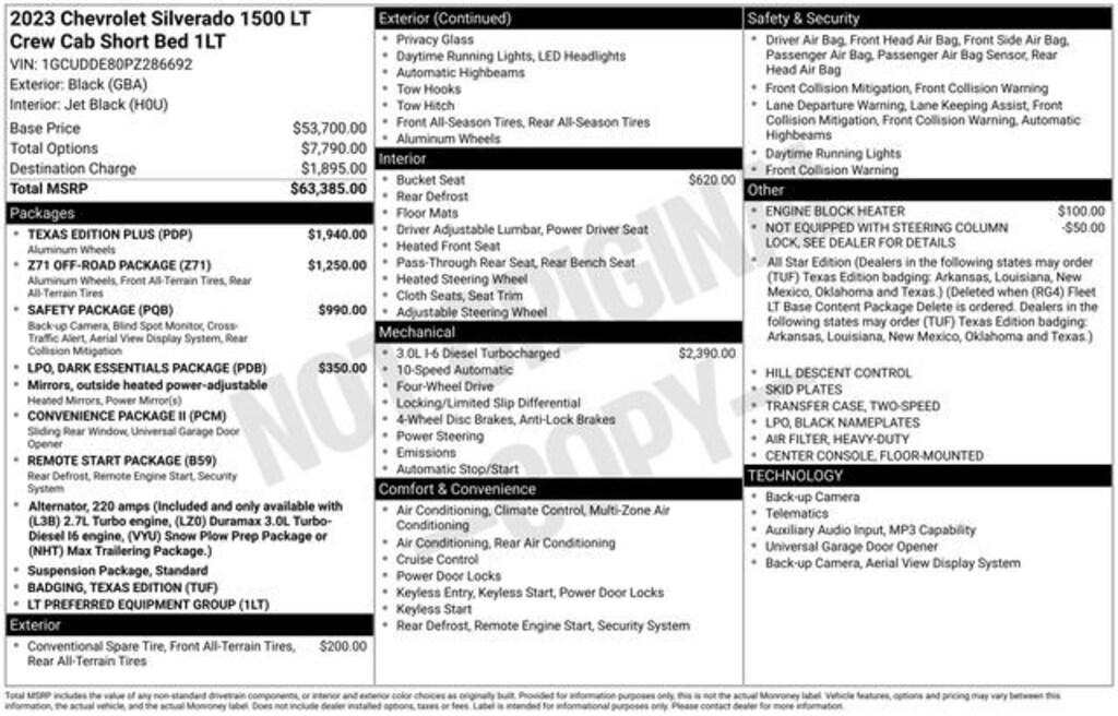 Welcome to Chuck Stevens Chevrolet located on HWY 31 South, Bay Minette Alabama. We are home of Lifetime Powertrain Warranty. A Lifetime Powertrain Warranty at no additional cost. Grab a great deal with our low-price guarantee on this 2023 Chevrolet Silverado 1500 while we still have it. At Chuck Stevens Chevrolet our Pre-Owned vehicles have been fully inspected and reconditioned by a certified technician. The Black 2023 Chevrolet Silverado 1500 with Black Cloth interior is a terrific choice.The online price includes a $2,500 Cash Down or trade equity. To qualify, customers must trade in a vehicle with a minimum appraised value of $2,500 or Cash Down. All prices reflect dealership financing and include a $1,000 finance coupon. See dealer for full details.Clean CARFAX.Recent Arrival! Odometer is 16474 miles below market average! 22/27 City/Highway MPG2023 Chevrolet Silverado 1500 LT Texas Edition Black 4D Crew Cab LT 4WD 3.0L I6 10-Speed AutomaticLIFETIME POWERTRAIN WARRANTY PROGRAM is included at no additional charge for all vehicles that have less than 80,000 miles. It is one of the most comprehensive powertrain warranty programs in the market. See dealer for details.