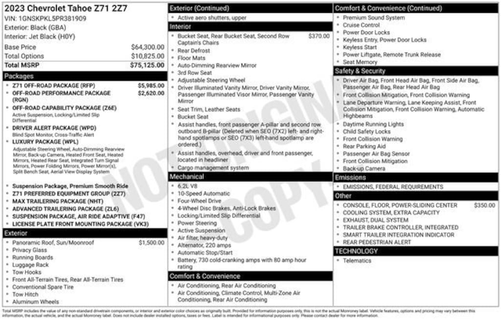 Welcome to Chuck Stevens Chevrolet located on HWY 31 South, Bay Minette Alabama. We are home of Lifetime Powertrain Warranty. A Lifetime Powertrain Warranty at no additional cost. Grab a great deal with our low-price guarantee on this 2023 Chevrolet Tahoe while we still have it. At Chuck Stevens Chevrolet our Pre-Owned vehicles have been fully inspected and reconditioned by a certified technician. The Black 2023 Chevrolet Tahoe with Black Leather interior is a terrific choice.The online price includes a $2,500 Cash Down or trade equity. To qualify, customers must trade in a vehicle with a minimum appraised value of $2,500 or Cash Down. All prices reflect dealership financing and include a $1,000 finance coupon. See dealer for full details.Recent Arrival!2023 Chevrolet Tahoe Z71 Black 4D Sport Utility Z71 4WD EcoTec3 6.2L V8 10-Speed Automatic with OverdriveLIFETIME POWERTRAIN WARRANTY PROGRAM is included at no additional charge for all vehicles that have less than 80,000 miles. It is one of the most comprehensive powertrain warranty programs in the market. See dealer for details.