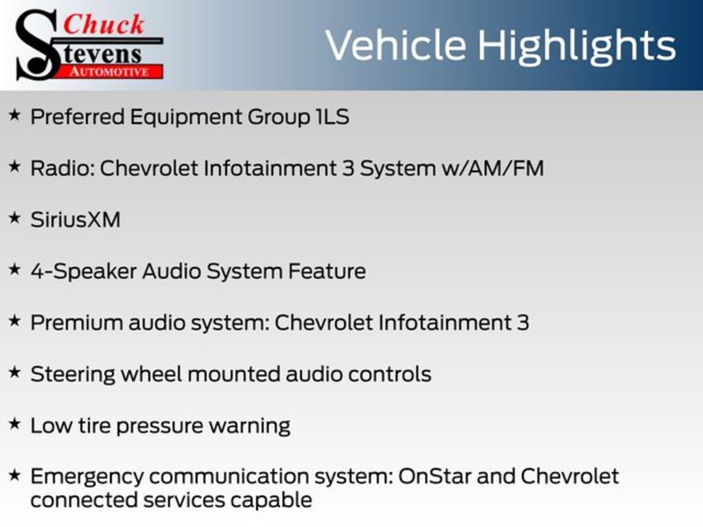 - Radio: Chevrolet Infotainment 3 System w/AM/FM