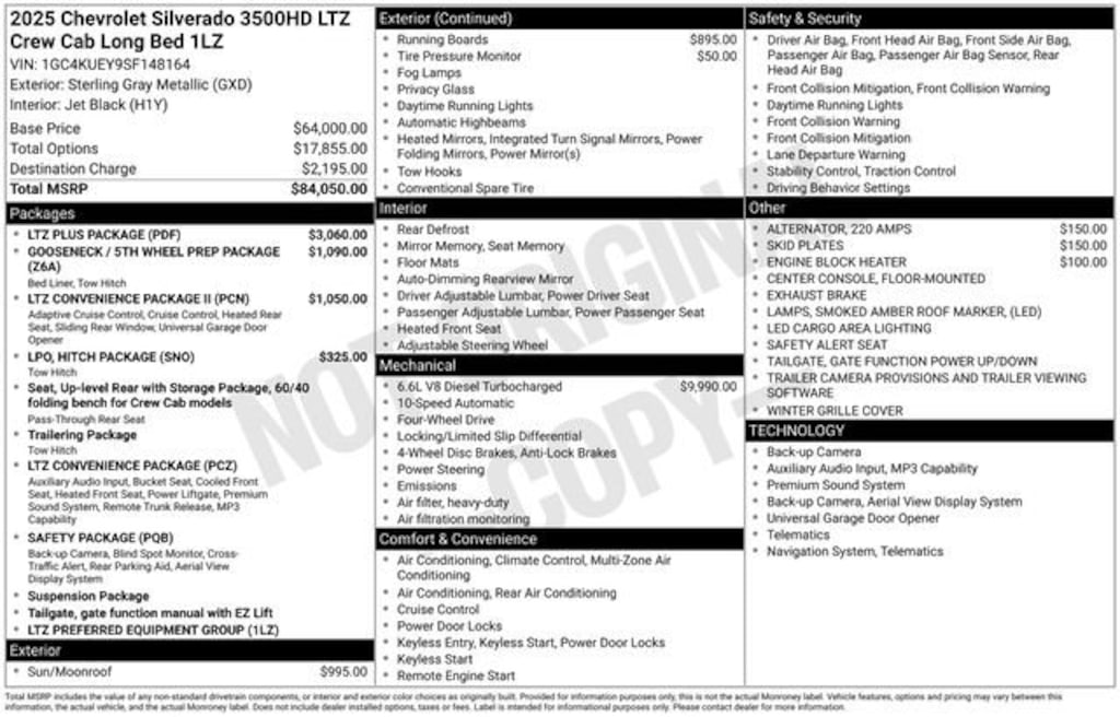 Welcome to Chuck Stevens Chevrolet located on HWY 31 South, Bay Minette Alabama. We are home of Lifetime Powertrain Warranty. A Lifetime Powertrain Warranty at no additional cost. Grab a great deal with our low-price guarantee on this 2025 Chevrolet Silverado 3500HD while we still have it. At Chuck Stevens Chevrolet our Pre-Owned vehicles have been fully inspected and reconditioned by a certified technician. The Sterling Gray Metallic 2025 Chevrolet Silverado 3500HD with Jet Black Leather interior is a fantastic choice.The online price includes a $2,500 Cash Down or trade equity. To qualify, customers must trade in a vehicle with a minimum appraised value of $2,500 or Cash Down. All prices reflect dealership financing and include a $1,000 finance coupon. See dealer for full details.Clean CARFAX.Recent Arrival!2025 Chevrolet Silverado 3500HD LTZ Sterling Gray Metallic 4D Crew Cab LTZ 4WD Duramax 6.6L V8 Turbodiesel 10-Speed AutomaticLIFETIME POWERTRAIN WARRANTY PROGRAM is included at no additional charge for all vehicles that have less than 80,000 miles. It is one of the most comprehensive powertrain warranty programs in the market. See dealer for details.