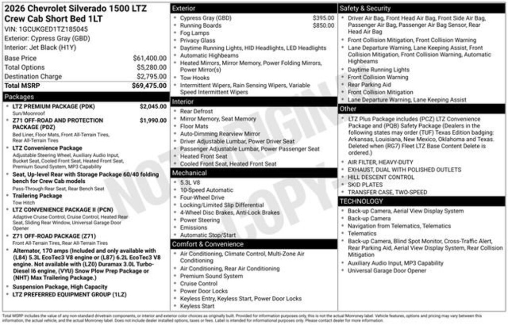Welcome to Chuck Stevens Chevrolet located on HWY 31 South, Bay Minette Alabama. We are home of Lifetime Powertrain Warranty. A Lifetime Powertrain Warranty at no additional cost. Grab a great deal with our low-price guarantee on this 2026 Chevrolet Silverado 1500 while we still have it. At Chuck Stevens Chevrolet our Pre-Owned vehicles have been fully inspected and reconditioned by a certified technician. The Cypress Gray 2026 Chevrolet Silverado 1500 with Black Leather interior is a fantastic choice.The online price includes a $2,500 Cash Down or trade equity. To qualify, customers must trade in a vehicle with a minimum appraised value of $2,500 or Cash Down. All prices reflect dealership financing and include a $1,000 finance coupon. See dealer for full details.Clean CARFAX.Recent Arrival!2026 Chevrolet Silverado 1500 LTZ Cypress Gray 4D Crew Cab LTZ 4WD EcoTec3 5.3L V8 10-Speed AutomaticLIFETIME POWERTRAIN WARRANTY PROGRAM is included at no additional charge for all vehicles that have less than 80,000 miles. It is one of the most comprehensive powertrain warranty programs in the market. See dealer for details.