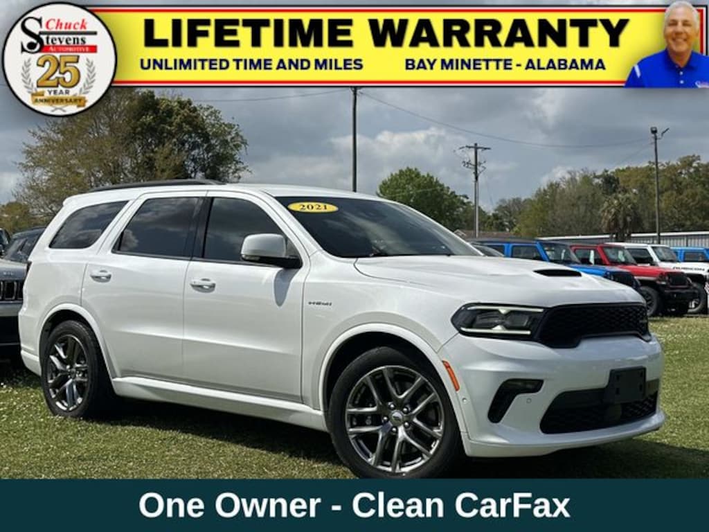 Welcome to Chuck Stevens Dodge Chrysler Jeep Ram Fiat located on HWY 31 South, Bay Minette Alabama. We are home of The Lifetime Powertrain Warranty at no additional cost. Grab a great deal with our low-price guarantee on this 2021 Dodge Durango R/T while we still have it. At Chuck Stevens our Pre-Owned vehicles have been fully inspected and reconditioned by a certified technician. The Off-white 2021 Dodge Durango R/T with Red/Black, Leather Trimmed Bucket Seats interior is a wonderful choice.