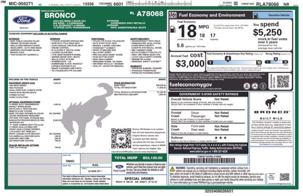 Welcome to Chuck Stevens Dodge Chrysler Jeep Ram Fiat located on HWY 31 South, Bay Minette Alabama. We are home of The Lifetime Powertrain Warranty at no additional cost. Grab a great deal with our low-price guarantee on this 2024 Ford Bronco while we still have it. At Chuck Stevens CDJRF our Pre-Owned vehicles have been fully inspected and reconditioned by a certified technician. The Gray Metallic 2024 Ford Bronco with Sandstone W/Black Onyx Vinyl interior is a great choice.