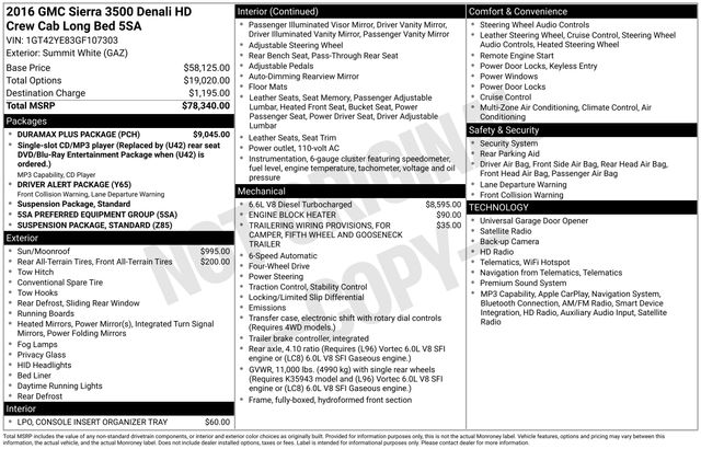 Take advantage of our low-price guarantee on this 2016 GMC Sierra 3500HD Denali. This rugged and capable pickup comes finished in White with a premium leather-appointed interior, making it a wonderful choice for your next vehicle.