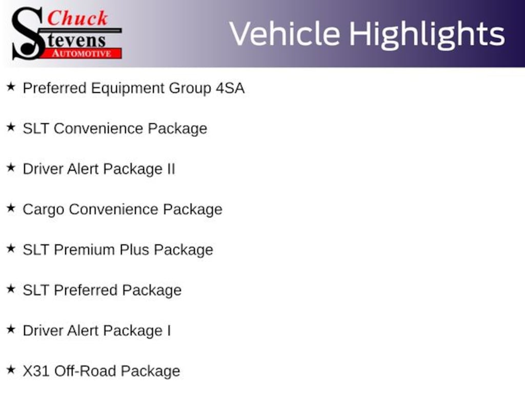 The SLT Premium Plus Package takes this Sierra to the next level, adding a power sunroof, chrome assist steps, a spray-on bedliner, and 20-inch polished aluminum wheels. The X31 Off-Road Package further enhances the Sierra's capabilities with an off-road suspension, hill descent control, skid plates, and all-terrain tires.