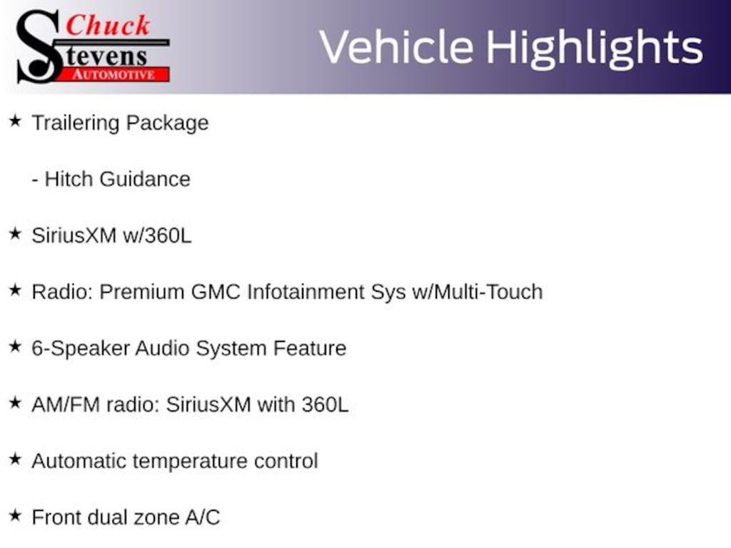 120-Volt Bed Mounted Power Outlet, 120-Volt Instrument Panel Power Outlet, 18" x 8.5" Machined Aluminum Wheels, 6-Speaker Audio System Feature, Alloy wheels, AM/FM radio: SiriusXM with 360L, Apple CarPlay/Android Auto, Auto-Locking Rear Differential, Automatic temperature control, Front Bucket Seats, Front dual zone A/C, Front fog lights, Fully automatic headlights, GMC Connected Access Capable, Heated Driver & Front Outboard Passenger Seating, Hill Descent Control, Hitch Guidance, In-Vehicle Trailering App, Integrated Trailer Brake Controller, Radio: Premium GMC Infotainment Sys w/Multi-Touch, Remote Vehicle Starter System, SiriusXM w/360L, Spray-On Pickup Bed Liner w/AT4 Logo, Steering wheel mounted audio controls, Telescoping steering wheel, Tilt steering wheel, Trailering Package, Ventilated Driver & Front Passenger Seats, Ventilated front seats, Wi-Fi Hotspot Capable.