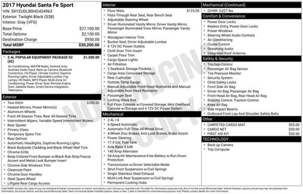 Welcome to Chuck Stevens Chevrolet located on HWY 31 South, Bay Minette Alabama. We are home of Lifetime Powertrain Warranty. A Lifetime Powertrain Warranty at no additional cost. Grab a great deal with our low-price guarantee on this 2017 Hyundai Santa Fe Sport while we still have it. At Chuck Stevens Chevrolet our Pre-Owned vehicles have been fully inspected and reconditioned by a certified technician. The Twilight Black 2017 Hyundai Santa Fe Sport with Gray Cloth interior is a superb choice.The online price includes a $2,500 Cash Down or trade equity. To qualify, customers must trade in a vehicle with a minimum appraised value of $2,500 or Cash Down. All prices reflect dealership financing and include a $1,000 finance coupon. See dealer for full details.Recent Arrival! 20/26 City/Highway MPG2017 Hyundai Santa Fe Sport 2.4 Base Twilight Black 4D Sport Utility 2.4 Base AWD 2.4L I4 DGI DOHC 16V 6-Speed Automatic with ShiftronicLIFETIME POWERTRAIN WARRANTY PROGRAM is included at no additional charge for all vehicles that have less than 80,000 miles. It is one of the most comprehensive powertrain warranty programs in the market. See dealer for details.