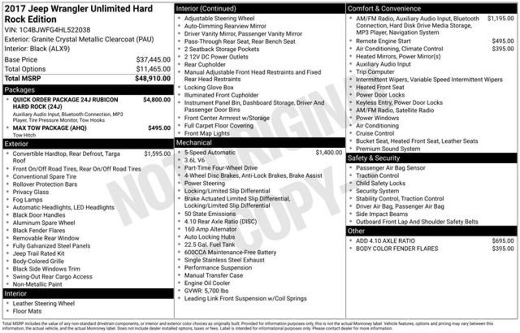 Welcome to Chuck Stevens Chevrolet located on HWY 31 South, Bay Minette Alabama. We are home of Lifetime Powertrain Warranty. A Lifetime Powertrain Warranty at no additional cost. Grab a great deal with our low-price guarantee on this 2017 Jeep Wrangler while we still have it. At Chuck Stevens Chevrolet our Pre-Owned vehicles have been fully inspected and reconditioned by a certified technician. The Granite Crystal Metallic Clearcoat 2017 Jeep Wrangler with Black Leather interior is a great choice.The online price includes a $2,500 Cash Down or trade equity. To qualify, customers must trade in a vehicle with a minimum appraised value of $2,500 or Cash Down. All prices reflect dealership financing and include a $1,000 finance coupon. See dealer for full details.Recent Arrival!2017 Jeep Wrangler Unlimited Rubicon Granite Crystal Metallic Clearcoat 4D Sport Utility Unlimited Rubicon 4WD 3.6L V6 24V VVT 5-Speed AutomaticLIFETIME POWERTRAIN WARRANTY PROGRAM is included at no additional charge for all vehicles that have less than 80,000 miles. It is one of the most comprehensive powertrain warranty programs in the market. See dealer for details.