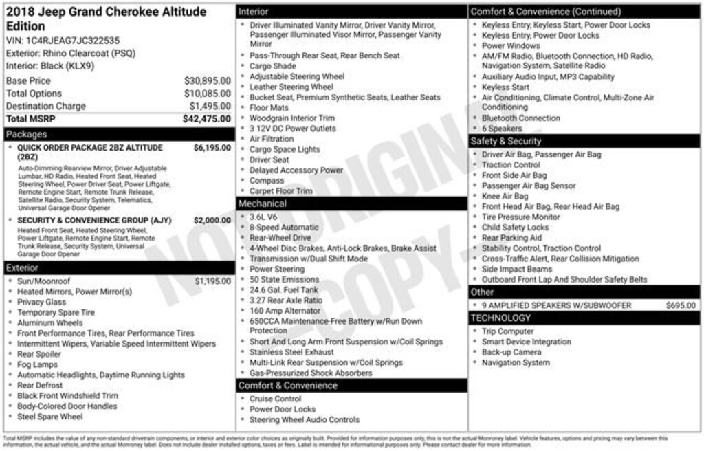 Welcome to Chuck Stevens Chevrolet located on HWY 31 South, Bay Minette Alabama. We are home of Lifetime Powertrain Warranty. A Lifetime Powertrain Warranty at no additional cost. Grab a great deal with our low-price guarantee on this 2018 Jeep Grand Cherokee while we still have it. At Chuck Stevens Chevrolet our Pre-Owned vehicles have been fully inspected and reconditioned by a certified technician. The Rhino Clearcoat 2018 Jeep Grand Cherokee with Black Leather interior is a fantastic choice.The online price includes a $2,500 Cash Down or trade equity. To qualify, customers must trade in a vehicle with a minimum appraised value of $2,500 or Cash Down. All prices reflect dealership financing and include a $1,000 finance coupon. See dealer for full details.Clean CARFAX.Recent Arrival! 19/26 City/Highway MPG2018 Jeep Grand Cherokee Altitude Rhino Clearcoat 4D Sport Utility Altitude RWD 3.6L V6 24V VVT 8-Speed AutomaticLIFETIME POWERTRAIN WARRANTY PROGRAM is included at no additional charge for all vehicles that have less than 80,000 miles. It is one of the most comprehensive powertrain warranty programs in the market. See dealer for details.