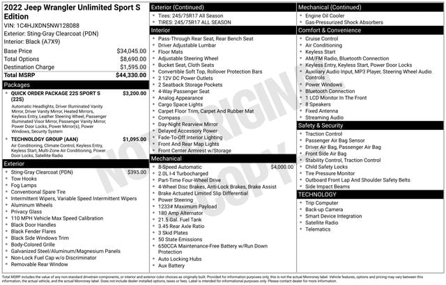Take advantage of our low-price guarantee on this 2022 Jeep Wrangler Unlimited Sport S. This Wrangler comes finished in Gray with a Gray interior, making it a wonderful choice for your next vehicle.
