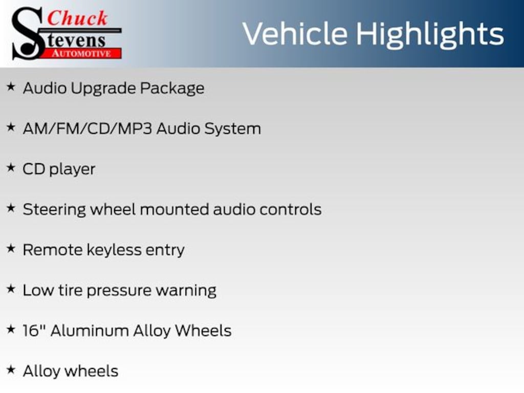 At Chuck Stevens Ford, we also include our exclusive Lifetime Powertrain Warranty at no additional cost. Serviceable at any certified repair facility nationwide.