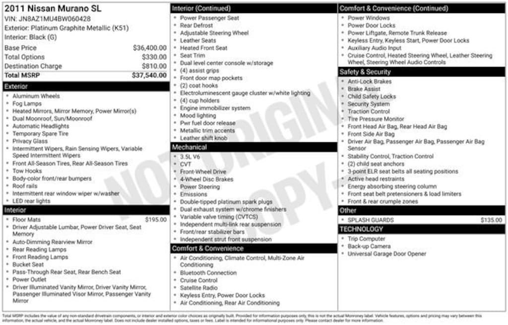 Welcome to Chuck Stevens Chevrolet located on HWY 31 South, Bay Minette Alabama. We are home of Lifetime Powertrain Warranty. A Lifetime Powertrain Warranty at no additional cost. Grab a great deal with our low-price guarantee on this 2011 Nissan Murano while we still have it. At Chuck Stevens Chevrolet our Pre-Owned vehicles have been fully inspected and reconditioned by a certified technician. The Platinum Graphite Metallic 2011 Nissan Murano with Black Leather interior is a great choice.The online price includes a $2,500 Cash Down or trade equity. To qualify, customers must trade in a vehicle with a minimum appraised value of $2,500 or Cash Down. All prices reflect dealership financing and include a $1,000 finance coupon. See dealer for full details.Clean CARFAX.Recent Arrival! Odometer is 27472 miles below market average!2011 Nissan Murano SL Platinum Graphite Metallic 4D Sport Utility SL FWD 3.5L V6 DOHC 24V CVTLIFETIME POWERTRAIN WARRANTY PROGRAM is included at no additional charge for all vehicles that have less than 80,000 miles. It is one of the most comprehensive powertrain warranty programs in the market. See dealer for details.