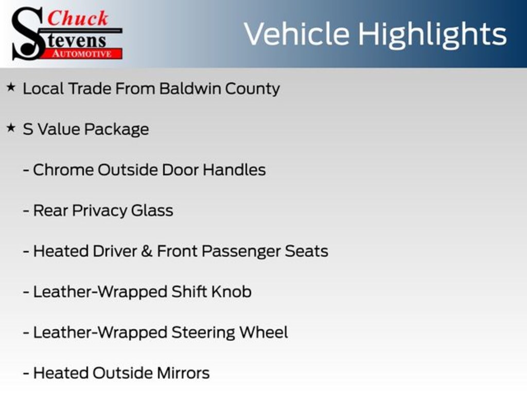 Local Trade From Baldwin County, 17" Alloy Wheels, Chrome Outside Door Handles, Heated Driver & Front Passenger Seats, Heated Outside Mirrors, Leather-Wrapped Shift Knob, Leather-Wrapped Steering Wheel, Rear Privacy Glass, Roof Rails, S Value Package.