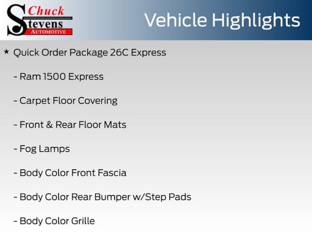 1-Year SiriusXM Radio Service, 20" x 9" Chrome Clad Aluminum Wheels, 40/20/40 Split Bench Seat, Body Color Front Fascia, Body Color Grille, Body Color Rear Bumper w/Step Pads, Carpet Floor Covering, Center Hub, Cloth 40/20/40 Bench Seat, Delete Class IV Receiver Hitch, Delete Spray In Bedliner, Dual Rear Exhaust w/Bright Tips, Fog Lamps, For More Info, Call 800-643-2112, Front & Rear Floor Mats, Front Armrest w/Three Cupholders, No Satellite Coverage w/AK/HI, Popular Equipment Group, Quick Order Package 26C Express, Ram 1500 Express, Rear Folding Seat, Remote Keyless Entry w/All-Secure, SIRIUSXM Satellite Radio.