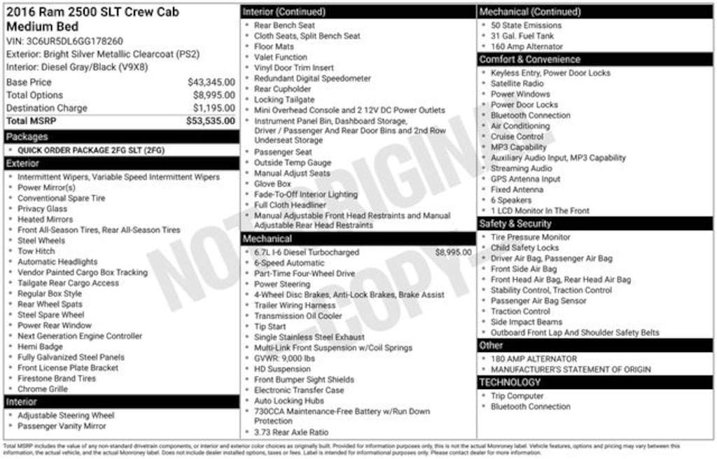 ⢠6.7L I-6 Diesel Turbocharged Cummins; includes GVWR: 10,000 lbs, 5.5 Additional Gallons of Diesel, Cummins Turbo Diesel Badge, Current Generation Engine Controller, Diesel Exhaust Brake, Selective Catalytic Reduction (Urea), Tow Hooks, 180 Amp Alternator, RAM Active Air
