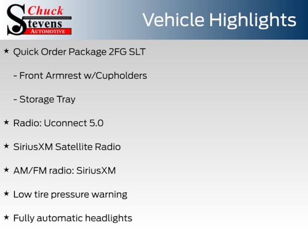 ⢠AM/FM radio: SiriusXM, Radio: Uconnect 5.0, SiriusXM Satellite Radio, Low tire pressure warning, Fully automatic headlights, Front Armrest w/Cupholders, Storage Tray, Center Hub, Rear Wheel Spats, Wheels: 18" x 8.0" Steel Chrome Clad