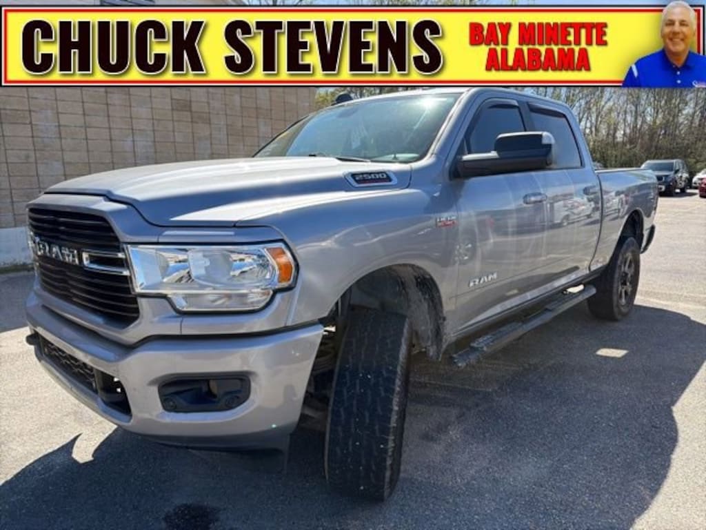 Welcome to Chuck Stevens Chevrolet located on HWY 31 South, Bay Minette Alabama. We are home of Lifetime Powertrain Warranty. A Lifetime Powertrain Warranty at no additional cost.Grab a great deal with our low-price guarantee on this 2019 Ram 2500 Big Horn while we still have it. At Chuck Stevens Chevrolet our Pre-Owned vehicles have been fully inspected and reconditioned by a certified technician. The Silver 2019 Ram 2500 Big Horn with Black, Premium Cloth Bucket Seats interior is a wonderful choice.The online price includes a $2,500 Cash Down or trade equity. To qualify, customers must trade in a vehicle with a minimum appraised value of $2,500 or Cash Down. All prices reflect dealership financing and include a $1,000 finance coupon. See dealer for full details.- Spray In Bedliner- LED Bed Lighting- Deployable Bed Step- Body Color Grille Surround- Body Color Door Handles- Sport Decal- Power Adjust/Fold & Heated Black Tow Mirrors- Power Folding Mirrors- 8.4 Touchscreen Display- Apple CarPlay- SiriusXM Satellite Radio- Rear 60/40 Folding Seat- Universal Garage Door OpenerThis impressive 2019 Ram 2500 Big Horn is powered by a robust 6.4L Heavy Duty V8 HEMI engine paired with an 8-Speed Automatic transmission and 4-Wheel Drive. With its rugged capability and premium features, this truck is ready to handle all your towing, hauling, and off-road adventures.The Big Horn Level 1 Equipment Group adds a wealth of desirable technology and convenience features, including the Uconnect 4 infotainment system with an 8.4 touchscreen display, Android Auto, Apple CarPlay, and SiriusXM satellite radio. Stay connected and entertained on the go.For your comfort and convenience, this Ram 2500 Big Horn is equipped with power-adjustable pedals, a leather-wrapped steering wheel, and a power-adjustable driver's seat with lumbar support. The premium cloth bucket seats provide all-day comfort, while the 60/40 split-folding rear seat offers versatile cargo-carrying flexibility.Enhance your driving experience with the Sport Appearance Package, which adds bold styling cues like a body-color grille surround, black interior accents, and a sport decal. The Bed Utility Group further improves functionality with a spray-in bedliner, LED bed lighting, and a deployable bed step for easy access.Don't miss your chance to own this well-equipped and stylish 2019 Ram 2500 Big Horn. Visit Chuck Stevens Chevrolet today and let us put you behind the wheel of this impressive truck.LIFETIME POWERTRAIN WARRANTY PROGRAM is included at no additional charge for all vehicles that have less than 80,000 miles. It is one of the most comprehensive powertrain warranty programs in the market. See dealer for details.