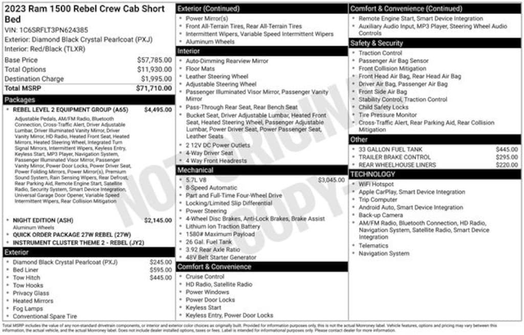 The Rebel's bold, distinctive styling sets it apart from the crowd. The blacked-out exterior accents, 18-inch gloss black wheels, and unique grille design give this truck an undeniably rugged and confident presence on the road. Whether you're tackling the daily commute or exploring the great outdoors, the 2023 Ram 1500 Rebel is up for the challenge.