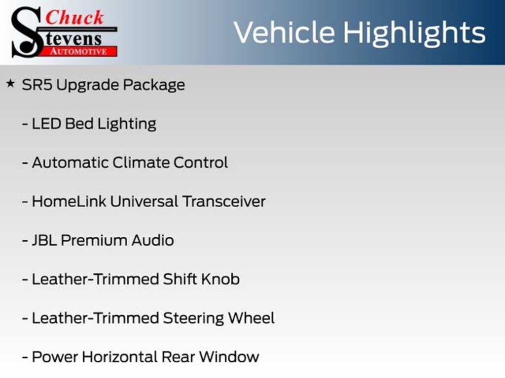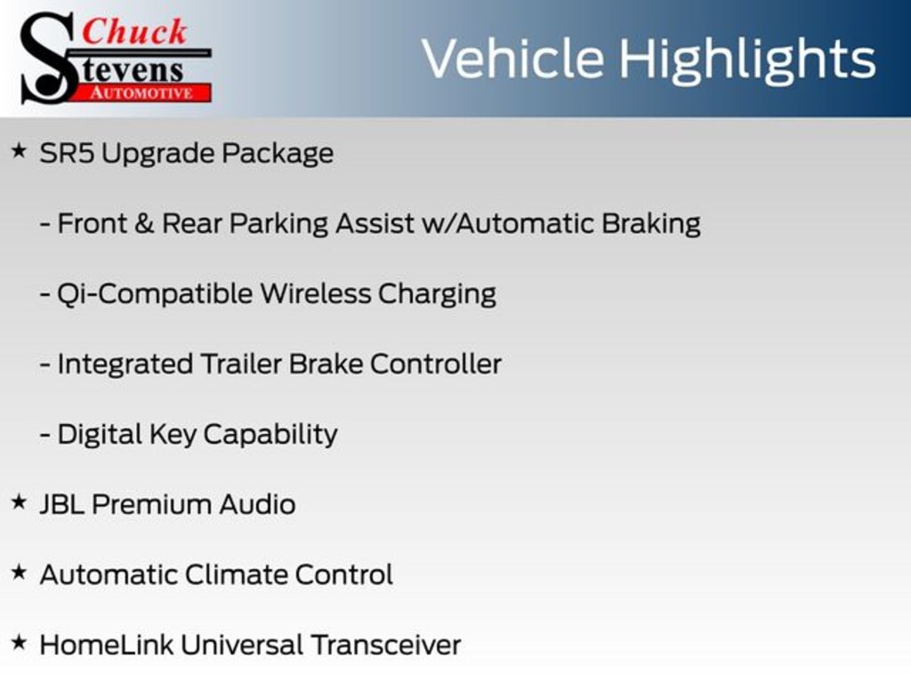 ABS brakes, Alloy wheels, Automatic Climate Control, Digital Key Capability, Electronic Stability Control, Front & Rear Parking Assist w/Automatic Braking, Heated door mirrors, HomeLink Universal Transceiver, Illuminated entry, Integrated Trailer Brake Controller, JBL Premium Audio, Leather-Trimmed Shift Knob, Leather-Trimmed Steering Wheel, LED Bed Lighting, Low tire pressure warning, Power Horizontal Rear Window, Qi-Compatible Wireless Charging, Remote keyless entry, SR5 Upgrade Package, Traction control.